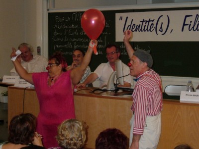 Un duo de clownanalystes s’engage sur votre projet : il s’informe, intègre la culture de l’organisme (documentation, entretiens téléphoniques) et s’adaptent à l’organisation de la manisfestation.